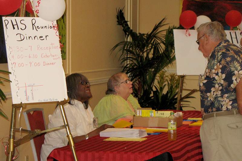 The big day! Some early-arriving classmates met for breakfast. Our registration table was set up in the lobby to greet arriving classmates and guests.